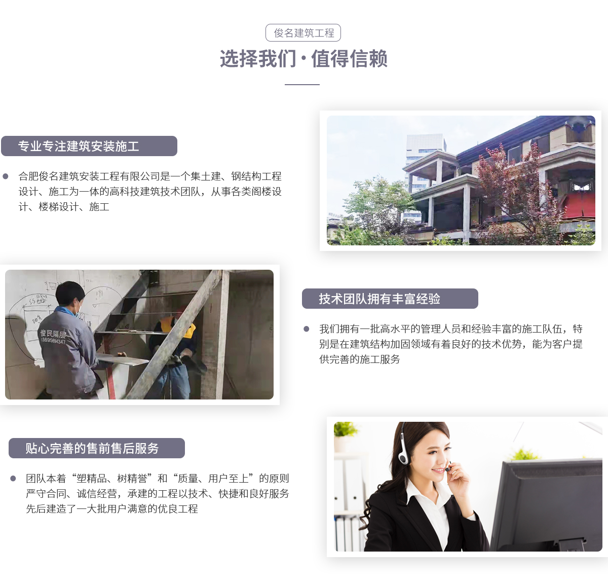 合肥俊名建筑安裝工程有限公司是一個(gè)集土建、鋼結(jié)構(gòu)工程設(shè)計(jì)、施工為一體的高科技建筑技術(shù)團(tuán)隊(duì),從事各類(lèi)閣樓設(shè)計(jì)、施工。我們擁有一批高水平的管理人員和經(jīng)驗(yàn)豐富的施工隊(duì)伍,特別是在建筑結(jié)構(gòu)加固領(lǐng)域有著良好的技術(shù)優(yōu)勢(shì)。團(tuán)隊(duì)員工精誠(chéng)團(tuán)結(jié),以“尊重規(guī)范,拒絕平凡”為宗旨,為客戶(hù)提供完善的施工服務(wù)。團(tuán)隊(duì)本著“塑精品、樹(shù)精譽(yù)”和“質(zhì)量、用戶(hù)至上”的原則,嚴(yán)守合同、誠(chéng)信經(jīng)營(yíng),所...